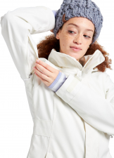 Kvalitní dámská snowboardová bunda od značky Burton, model Jet Set. Bunda je vyrobena za pomoci dvouvrstvého materiálu DRYRIDE s voděodolností 10.000 mm a prodyšností 5.000 g/m2/24 h a je zateplena pomocí technologie ThermacoreECO® (poměrem 80g celoplošně). Bunda dále využívá technologie Living Lining™, což je termoregulační technologie. Bunda nabízí podlepené kritické švy, zapínání na celopropínací zip (krytý légou na suché zipy a druky), vnitřní fleece kapsu na suchý zip s vývodem na sluchátka, kapucu na tříbodové stahování s kompatibilitou pro helmu, zvýšený límec s částečnou fleece podšívkou (zabraňující odření brady), dvě přední kapsy na zip s fleece podšívkou, jednu vnitřní síťovanou kapsu, průhlednou kapsu na jmenovku a neodnímatelný sněžný pás, který se zapíná pomocí druků. Bunda má větraní v podpaží, které je kryté zipem a síťovinou. Samozřejmostí jsou manžety, které lze stáhnout pomocí suchého zipu a spodní lem na dvoubodové stahování. Svrchní materiál: 100% polyester, zateplení: 100% polyester, podšívka: 100% nylon.