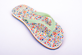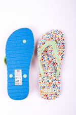Dámské žabky Adio model DOPPLER s pevnou podrážkou a barevným potiskem. Popruhy z umělé hmoty, potisk na patě, logo Adio na popruhu.
