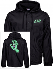 Pánská bunda od značky SANTA CRUZ, model FSU HAND - moderní coach jacket provedení - zapínání na knoflíky v provedení s kapucou, v přední části dvě volně dostupné kapsy, potisk s designem značky je tištěný na přední a zadní straně bundy. Bunda má lehce pružný spodní lem a pružné manžety. Materiál: 100% nylon.
